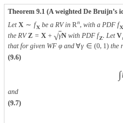Let $\mathbf{X}\sim f_{\mathbf{X}}$ be a RV in ${\mathbb{R}}^{n}$, with a PDF $f_{\mathbf{X}}\in {C}^{2}$. For a standard Gaussian RV $\mathbf{N}\sim \mathrm{N}(\mathbf{0},\mathbf{I}_{d})$ independent of X, and given $\gamma >0$, define the RV $\mathbf{Z}=\mathbf{X}+\sqrt{\gamma }\mathbf{N}$ with PDF $f_{\mathbf{Z}}$. Let $\mathbf{V}_{r}$ be the d-sphere of radius r centered at the origin and having surface denoted by $\mathbf{S}_{r}$. Assume that for given WF φ and $\forall \gamma \in (0,1)$ the relations
