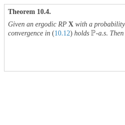\[\underset{n\to \infty }{\lim }\frac{1}{n}\varphi _{n}\big({\mathbf{X}_{0}^{n-1}}\big)=\alpha ,\hspace{1em}\mathbb{P}\text{-a.s.}\hspace{0.2778em}\text{and/or in}\hspace{2.5pt}\mathrm{L}_{2}(\mathbb{P}).\]Theorem 10.1.