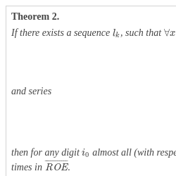 So by the Borel–Cantelli Lemma, $\lambda (A_{i_{0}})=0$, i.e. for λ-almost all $x\in [0,1]$ their $\overline{\mathit{ROE}}$ contains arbitrary digit i only finitely many times.